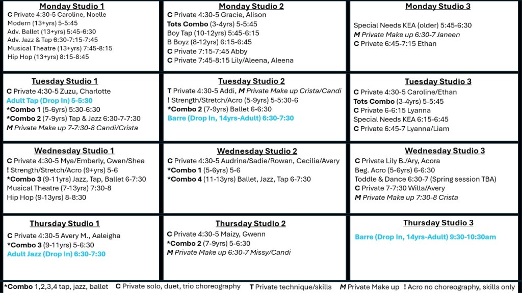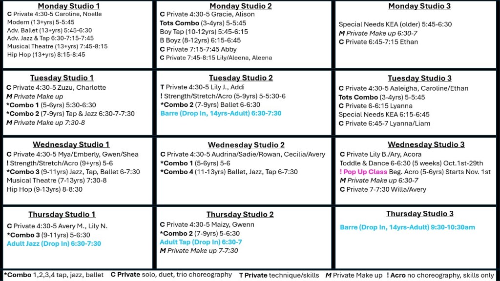 This is a non-competitive, age placement studio. The students are compared only to themselves, learning to work hard and be better than they were the day before. In some cases, students may be invited into a higher or lower level class, based on skill and comfort within the class.